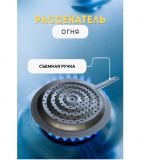 Рассекатель пламени изготовлен из стали с хромированным покрытием, что обеспечивает его долговечность и устойчивость к высоким температурам. Благодаря этому, он берет на себя контакт с пламенем и изолирует посуду от огня, защищая ее дно от перегрева.